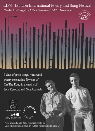 LIPS is a poetry and song festival taking as a focal point POETRY backed by music as first brought to New York by LIPS stalwart DAVID AMRAM and JACK KEROUAC in 1957. In bringing my old friend DAVID AMRAM (see www.davidamram.com) to Britain, we were also celebrating the 50th anniversary of Kerouac’s ON THE ROAD. Poets such as London’s JOHN HEGLEY and DAVID JAY and POLAR BEAR, and Brighton’s NAOMI FOYLE and BERNADETTE CREMIN rubbed shoulders with Amram and ace New York performance poet FRANK MESSINA and beat muse and biographer CAROLYN CASSADY as well as MICHAEL HOROVITZ and many others. The audience clearly enjoyed tthe special atmosphere created by so many people, young and old, under the spell of the ongoing tradition of the Beat Generation in the presence of two of its last survivors.